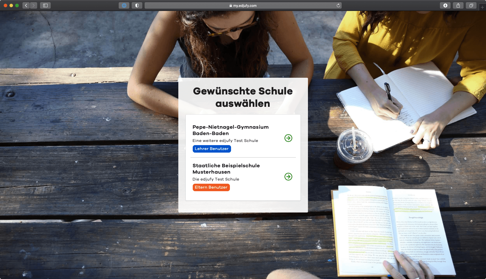 edjufy ist eine multi-account fähige Anwendung die es Ihnen ermöglicht, an verschiedenen Schulen unterschiedliche Rollen wahrzunehmen. Sollten Sie als Lehrer und Elternteil an verschiedenen Schulen einen Account haben, wählen Sie nach dem Login bitte die gewünschte Schule aus.