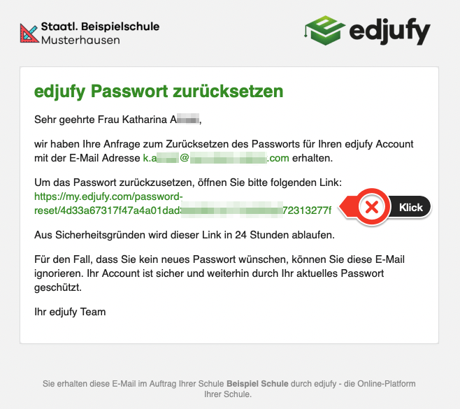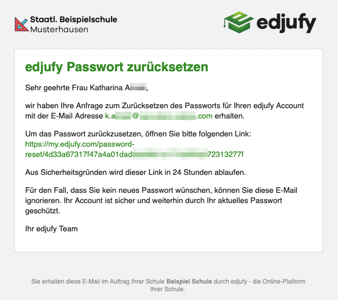 By clicking the Reset Password button in the previous view, edjufy checks whether an account exists for the entered email address. If so, you will receive a message at this email address with a link to reset your password. This email looks approximately like the following example.