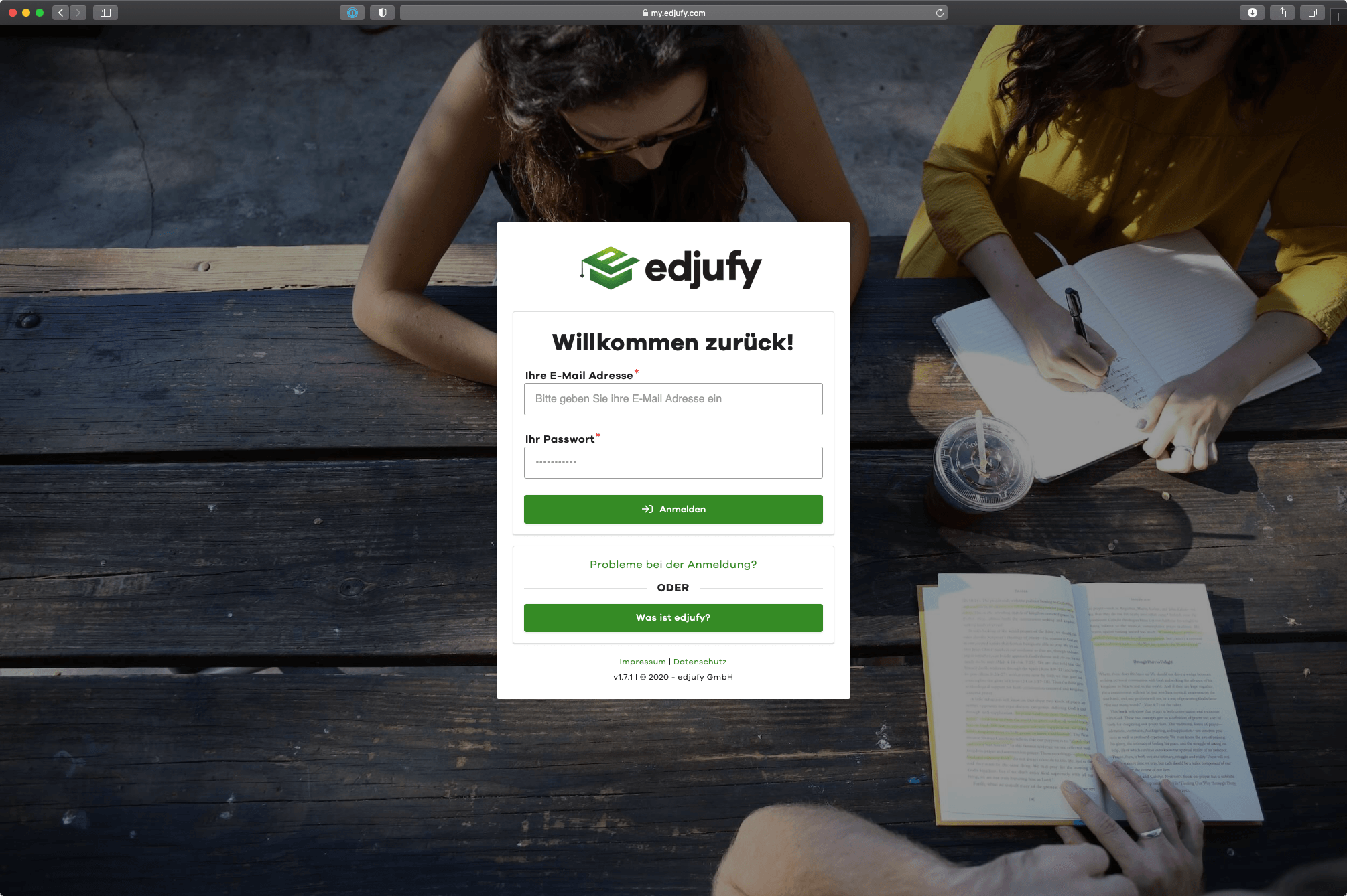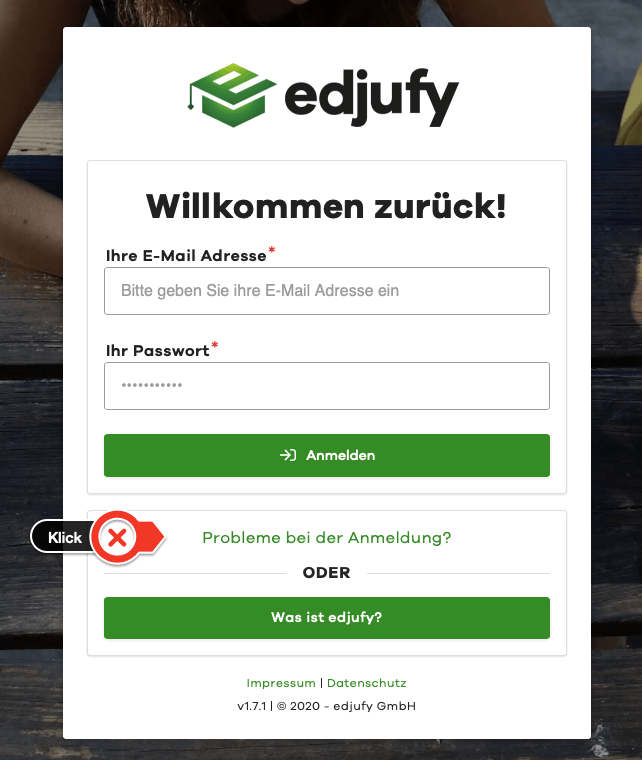 To work with edjufy, simply log in with your personal credentials at http://my.edjufy.com. You defined these yourself during the Initial Registration. If you have forgotten your password, you can reset it at https://my.edjufy.com/login/problem.